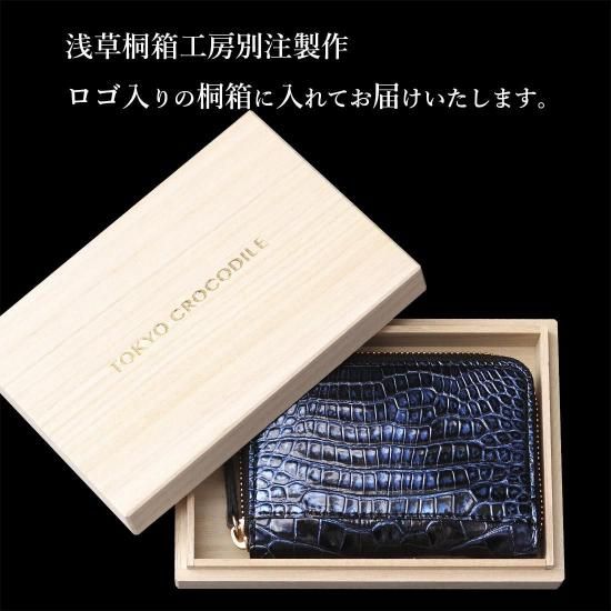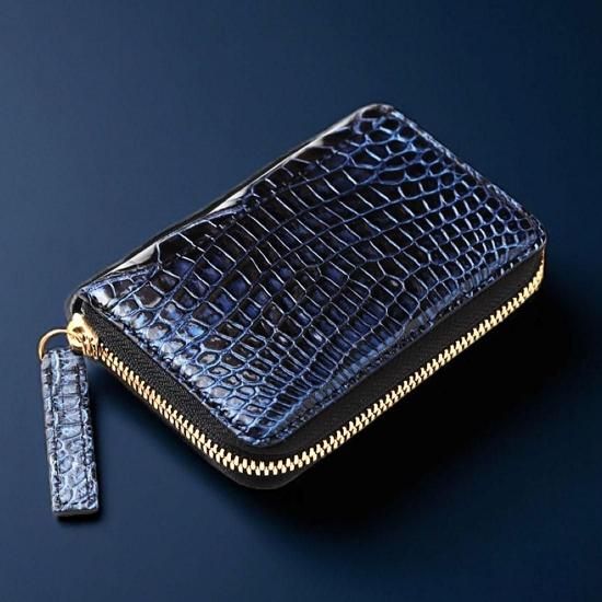 クロコダイル革の全流通量の中で十数%しか流通しない貴重なスモールクロコダイル(ポロサス)。コスモブルーカラーに染め上げられたポロサスを機能性十分な手のひらサイズに収まるマルチケースに仕上げた。