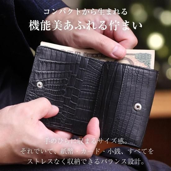 クロコダイルという素材の圧倒的な存在感を、小さな器で、最も美しく表現する。その挑戦の果てに辿り着いたのが、この折り財布です。 マット仕上げのナイルクロコダイルは、決して派手ではない。しかし、手にした瞬間に伝わる“本物の重み”があります。 手のひらに収まるサイズ感。それでいて、紙幣・カード・小銭、すべてをストレスなく収納できる機能美あふれるお財布です。